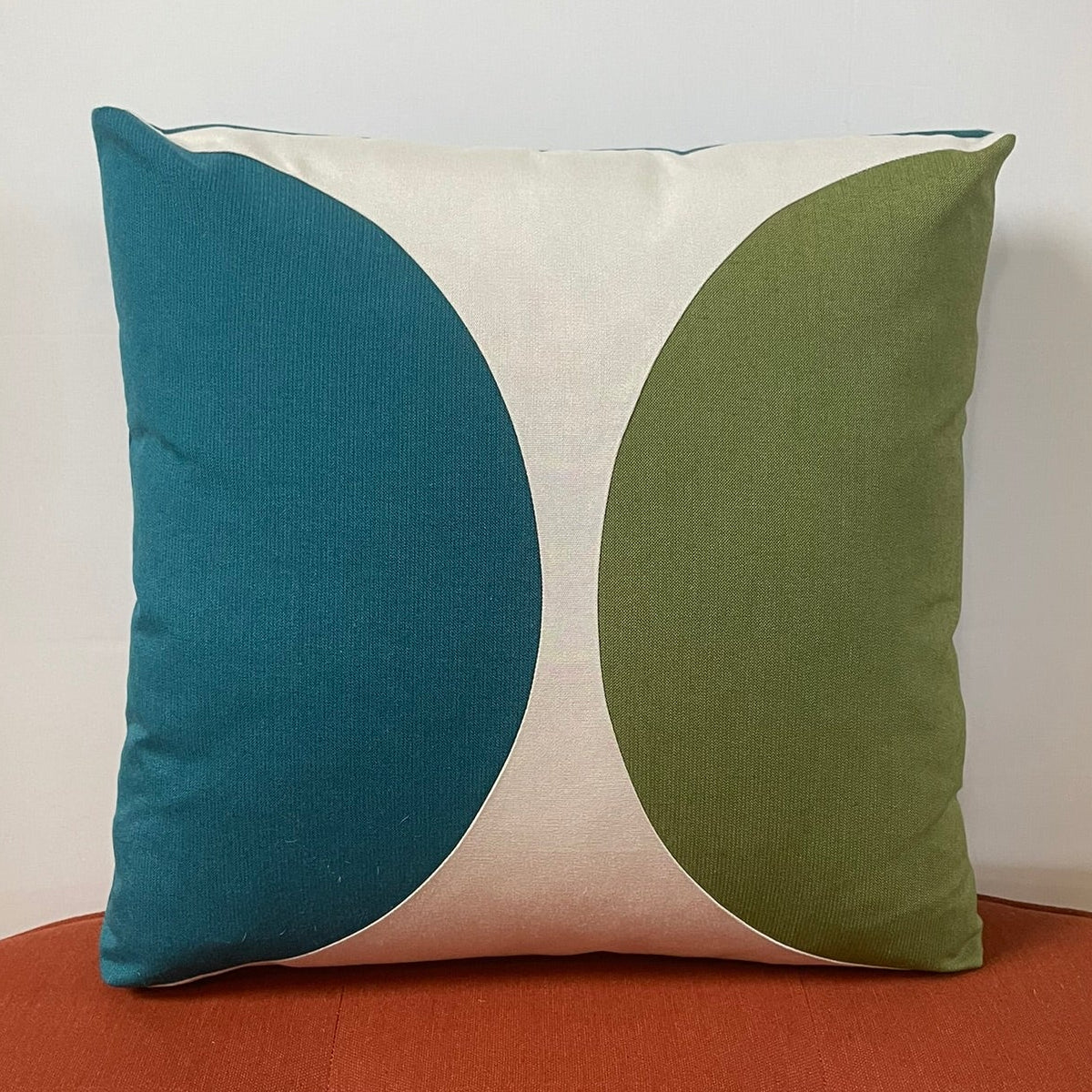 Our Eclipse Pillow is a fun and functional decorative pillow.  It features a Cilantro, Off-White and Peacock front, with a Peacock Back Panel.